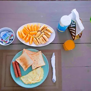The accommodation offers breakfast with fresh fruits and pancakes.